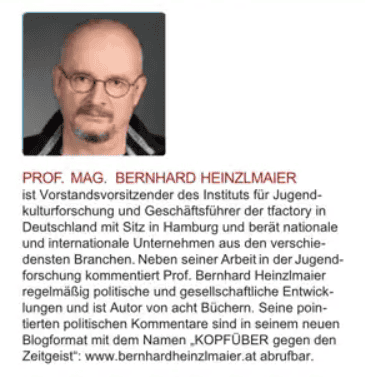 Der Jugendforscher, mehrfacher Buchautor, Philosoph, Blogger und Unternehmer Professor Magister Bernhard Heinzlmaier erläutert in der Videoaufzeichnung seines Vortrags die Werte und das Verhalten der Nachkriegsgeneration der sogenannten Babyboomer gegen die junge Generation Z“ der Zoomer anhand von aktuellen Marktforschungsergebnissen und konkreten Beispielen aus der Research-Praxis die Babyboomer mit der Generation Z .